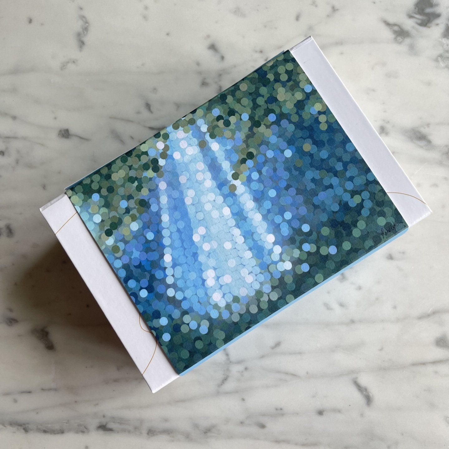 This new puzzle is made using the image of a favorite painting entitled, ‘This Place is a Shelter’. It’s a peaceful scene in greens and blues, portraying light breaking through trees in a forest. It comes in a cute box that includes a velvet bag for holding the pieces, glue and instructions for turning your puzzle into a keepsake, and an image card for reference.