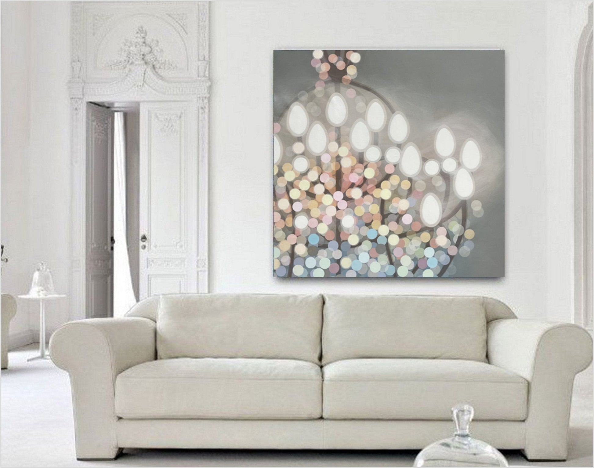 This enchanting chandelier painting glows with a soft, ethereal radiance, capturing the magic of light in the most delicate and feminine way. Gentle pastels of blush pink, golden peach, and sky blue seem to twinkle, creating a sense of wonder and whimsy. The luminous white bulbs shine like tiny stars, casting a warm and elegant glow that feels both graceful and inviting. A misty, silvery backdrop adds an air of mystery, allowing the shimmering orbs to float like a celestial dance of light and color. This piece embodies the beauty of hope, inspiration, and all the dazzling moments that make life feel truly luminous.