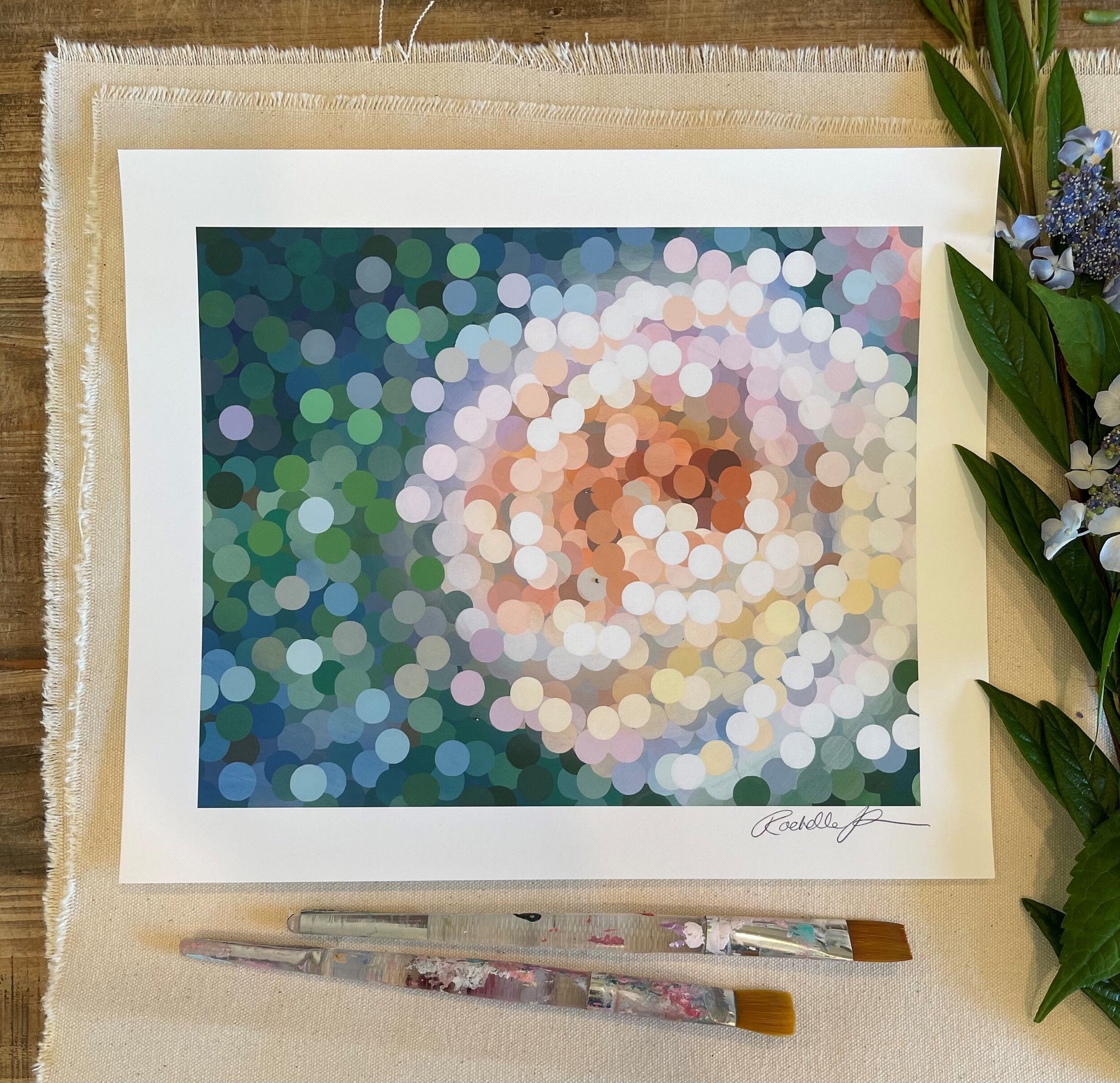This print feels like a rose caught in a daydream, softly glowing in a world of dappled light. Creamy whites and warm peaches swirl together, forming delicate petals that seem to shimmer with a quiet elegance. Hints of lavender and blush pink peek through, like whispered secrets in the breeze. Surrounding it all, deep forest greens and misty blues create a lush, cool backdrop, as if the flower is floating in a sea of soft focus. It’s a dreamy, almost hypnotic dance of color—like looking at nature through a lens of pure nostalgia.